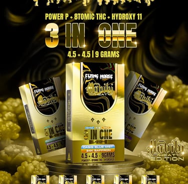 The Flying Horse Black Edition 9g is described as an ultra-potent 9g blend, and product pages highlight premium ingredients and multi-flavor functionality in some versions.